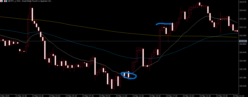 上記青丸で安値売りをし、みるみる上昇、青ラインで損切となりました。