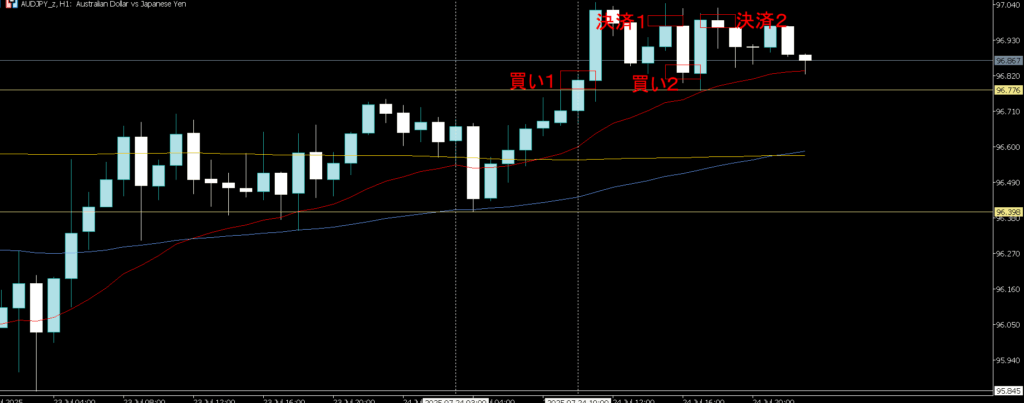次にNY開始と共に東京の高値ラインまで押したところで再び買い2。これはどんどん伸びるかと思ったんですが、あまり勢いがなかったので+10PIPSで利確。