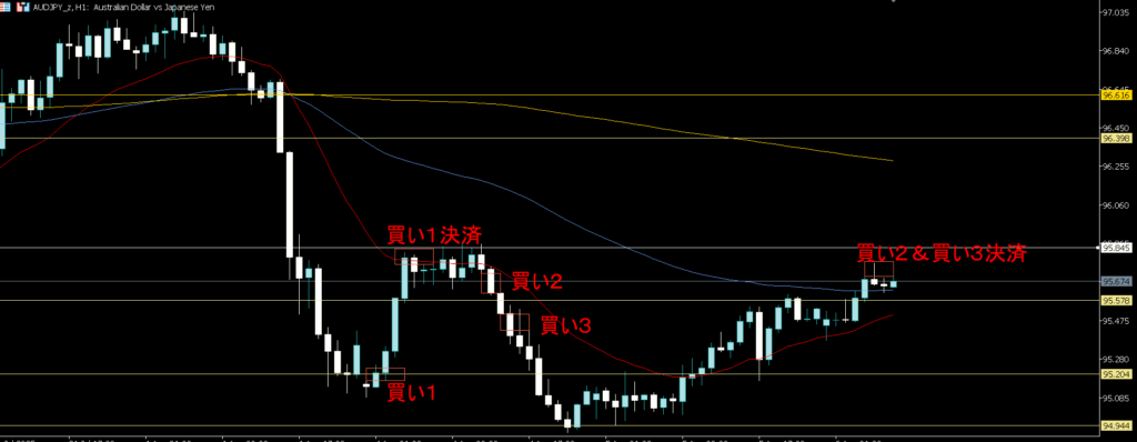 次の買い二発はあまり懸命なエントリーではなかったですが、24時間くらい待って無事利確