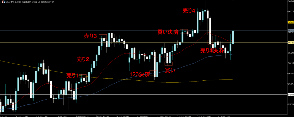 いつものようにオージー円のトレードです。いきなり売りを3発入れてますね。